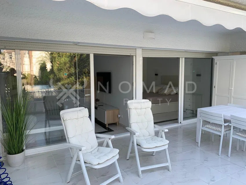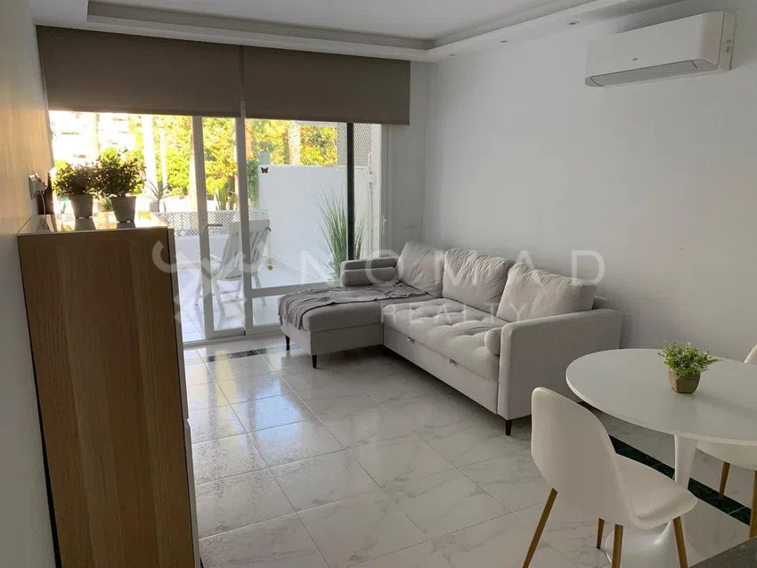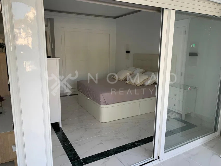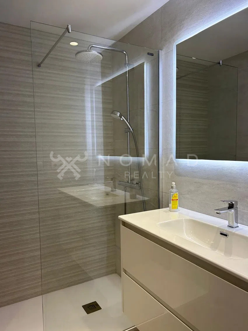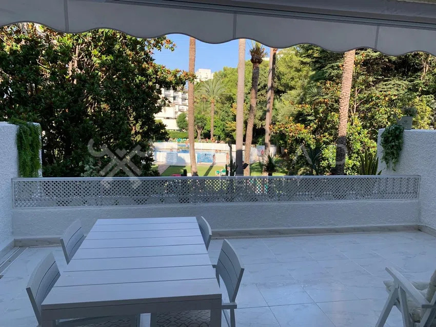 El piso cuenta con un amplio salón muy bien iluminado que se abre a la terraza de 30 m2 con orientación sur con vistas a los jardines y piscina comunitaria. Por su parte, la cocina de estilo semi abierto, se encuentra totalmente amoblada. La habitación principal es cómoda equipada con armarios empotrados y tiene acceso también a la terraza. El baño tiene excelentes acabados y fue, al igual que todo el piso, reformado no hace mucho tiempo. También en la terraza encontrarás un espacio que se diseñó para lavandería o trastero.