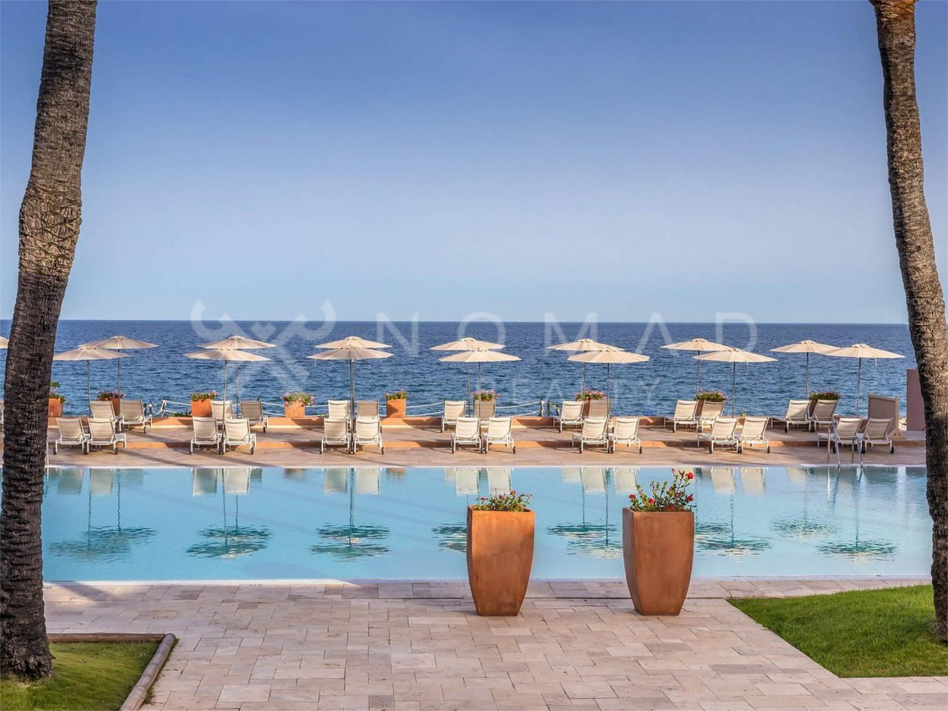 Localizado a pocos metros de la playa y prácticamente en primera línea de golf este chalet de 100m2 interiores con 38m2 de terrazas de orientación suroeste ofrece dos cómodas habitaciones equipadas con armarios empotrados, dos baños completos con acabados top, cocina totalmente renovada, plaza de garaje subterránea y trastero.